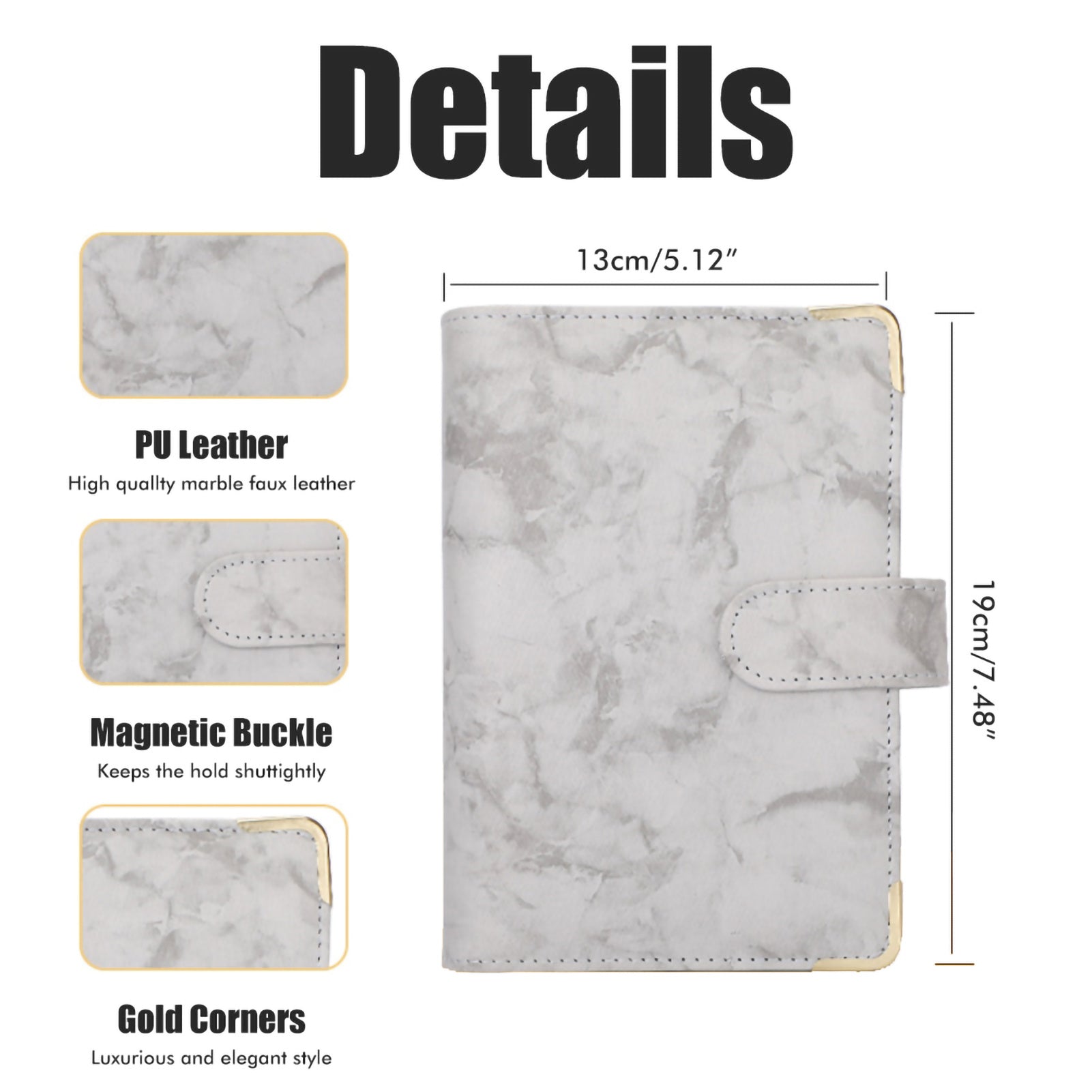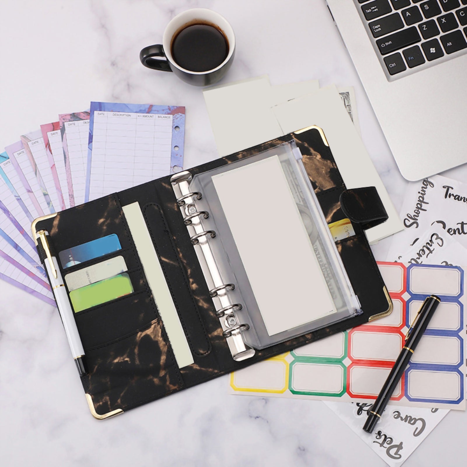 A6 PU Leather Budget Binder A6 Notebook Binder for Budgeting Money Saving Folder Marble Pattern Corner Protector Black